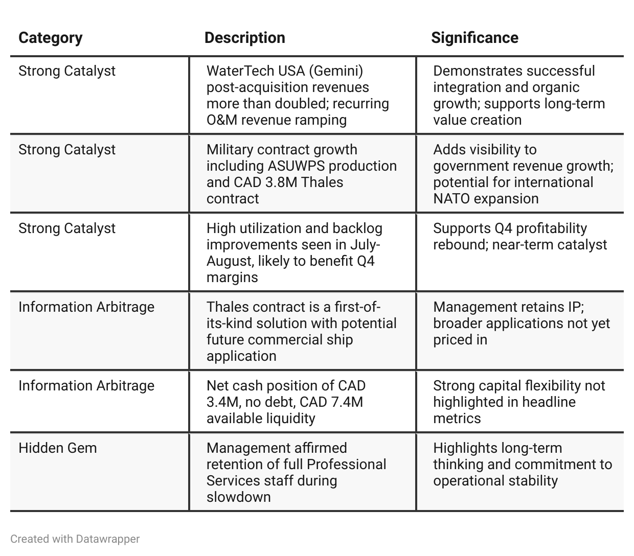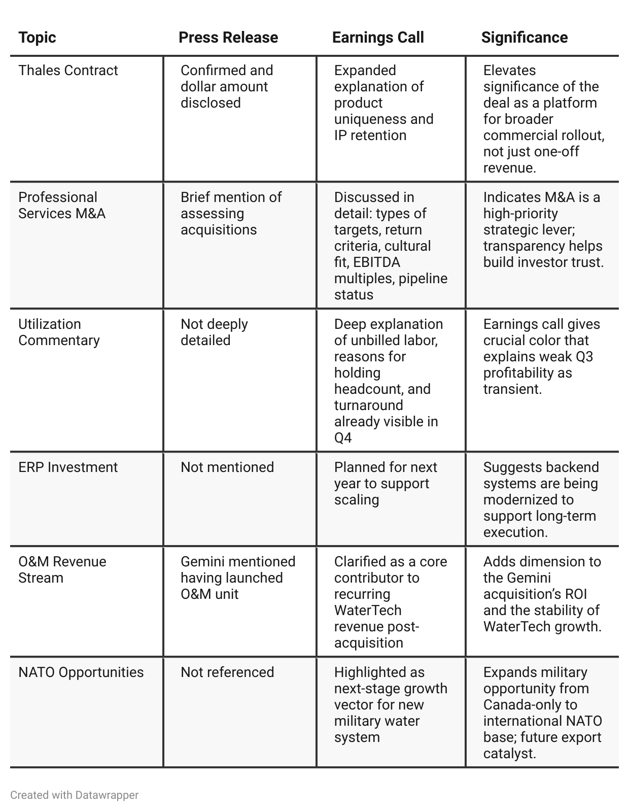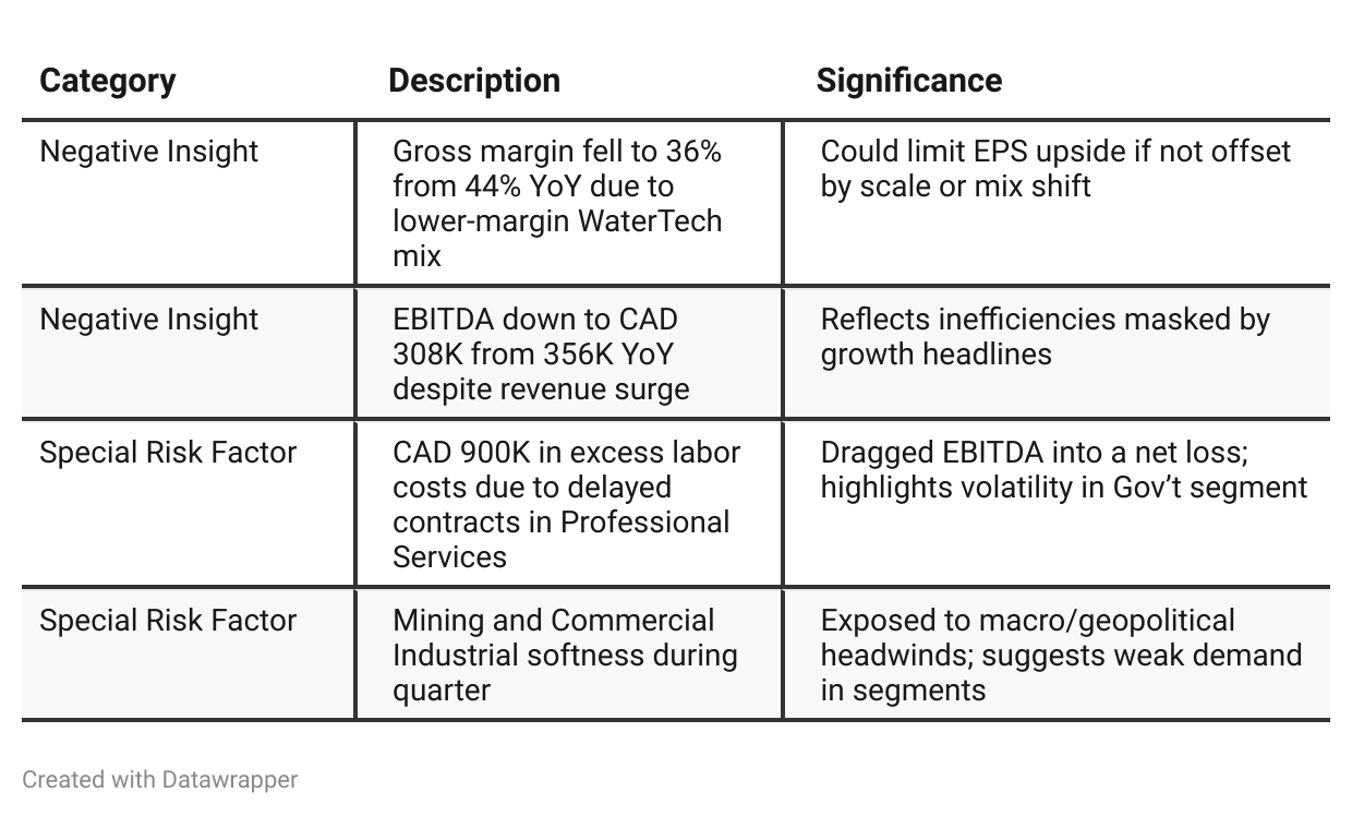 Between Q2 and Q3 2025, BluMetric’s narrative evolved from execution under strain to strategic expansion and recovery. In Q2, management leaned on WaterTech USA’s growth to offset Professional Services weakness from Canadian election delays. The message was about resilience, holding staff, and waiting for utilization recovery.