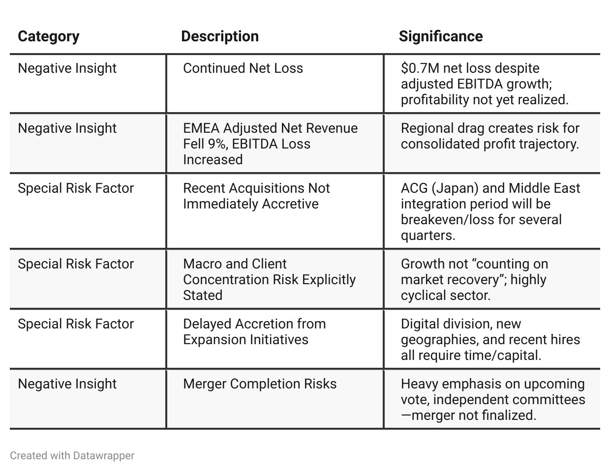 Client Diversification: Discusses expansion of both global footprint and services (from “geographic holes” to digital/brand/exec search), hinting at both growth opportunity and execution complexity.