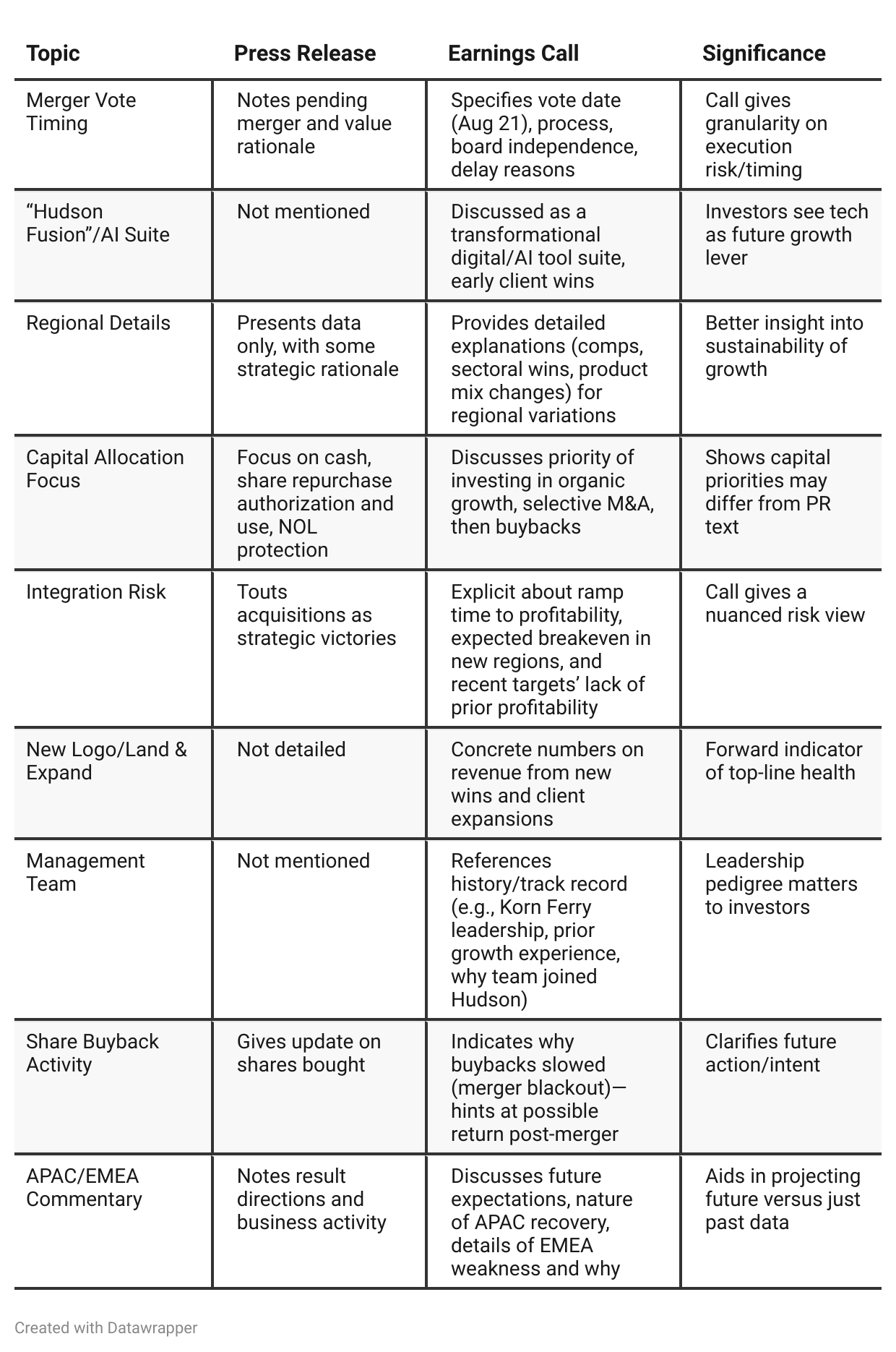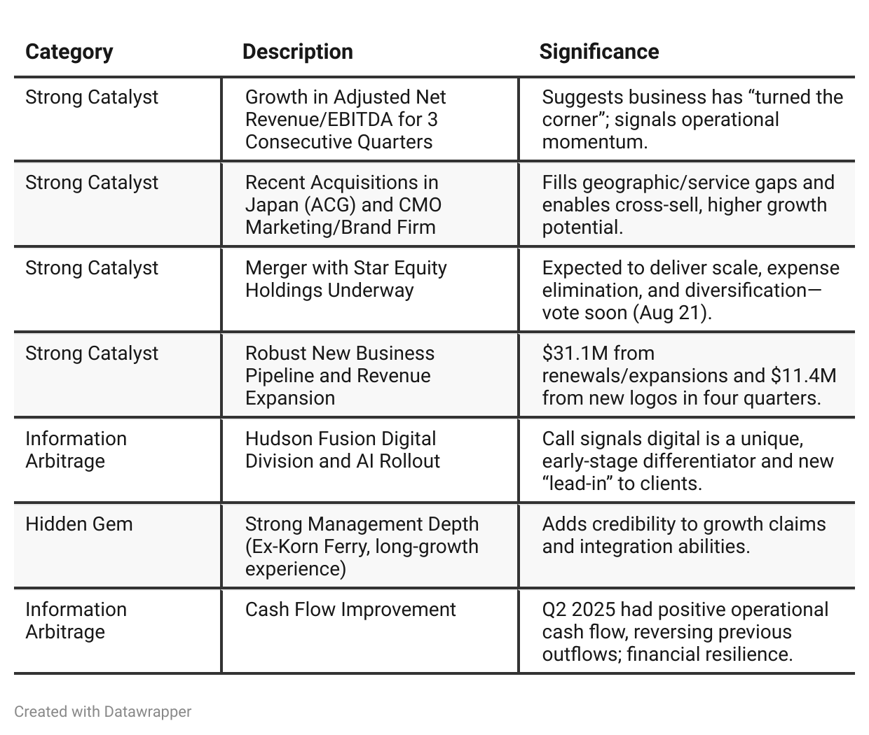 Earlier Call (Q1 2025): Hudson Global described itself as a company in transition—recovering from a tough external environment, rebuilding after underinvestment, and focusing on the foundational steps of leadership hiring, digitization, and plugging service gaps. Management emphasized the importance of stabilizing results, assembling the right team, and preparing the company to capitalize when market conditions inevitably improve.Latest Call (Q2 2025): The narrative advances decisively. Hudson now presents itself as past the inflection point—delivering multiple quarters of improving operational results, already commercializing its digital investment, securing substantial new business, and executing on strategic deals. The upcoming Star Equity merger represents a credible next phase—moving from foundational work to unlocking scale and diversification. Management’s tone is more confident, shifting from hope to delivery.